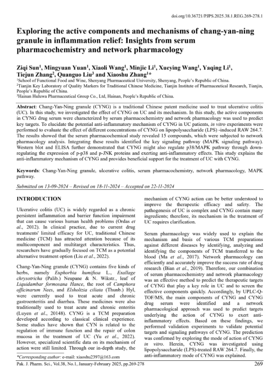 此次發(fā)表的文章題為《腸炎寧顆粒緩解炎癥的物質(zhì)基礎(chǔ)和藥理機(jī)制:血清藥理學(xué)與網(wǎng)絡(luò)藥理學(xué)綜合研究》,刊登于巴基斯坦制藥科學(xué)雜志(Pak. J. Pharm. Sci.)。該研究深入探討了腸炎寧顆粒(CYNG)在治療潰瘍性結(jié)腸炎(UC)中的作用機(jī)制,通過血清藥理學(xué)和網(wǎng)絡(luò)藥理學(xué)的綜合方法,揭示了其抗炎活性成分及關(guān)鍵信號(hào)通路,為腸炎寧顆粒的臨床應(yīng)用提供了堅(jiān)實(shí)的科學(xué)依據(jù)。